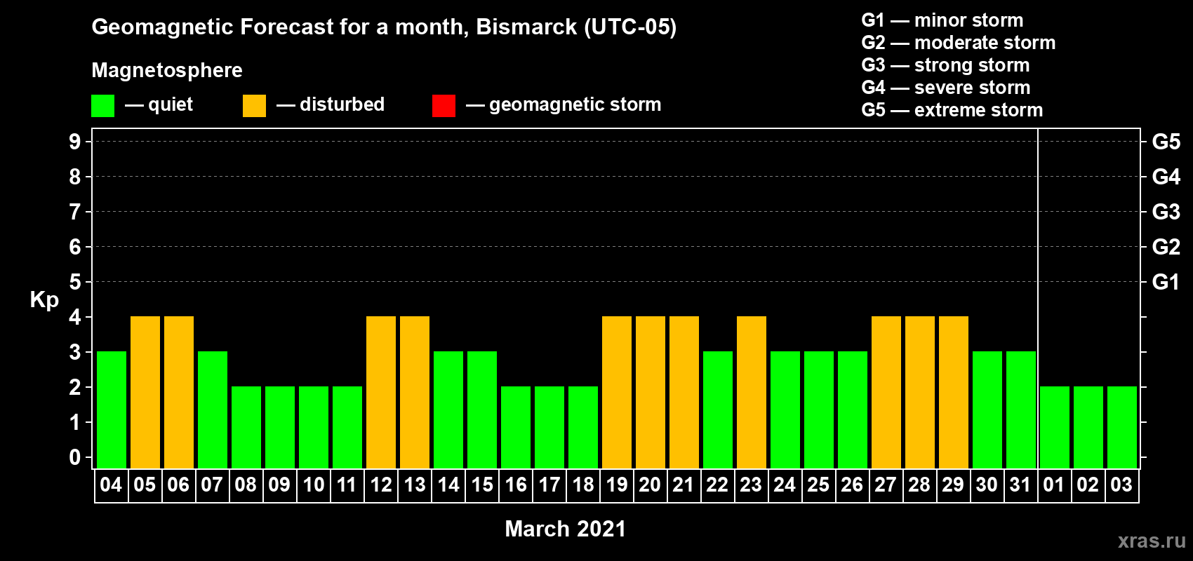 Geomagnetic storm forecast in Bismarck for Mar 04, 2021