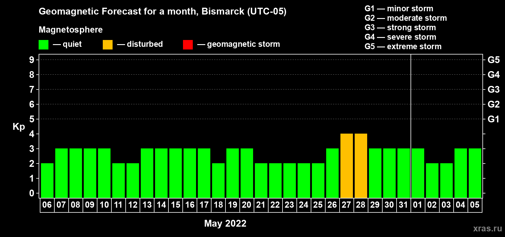 Geomagnetic storm forecast in Bismarck for May 06, 2022