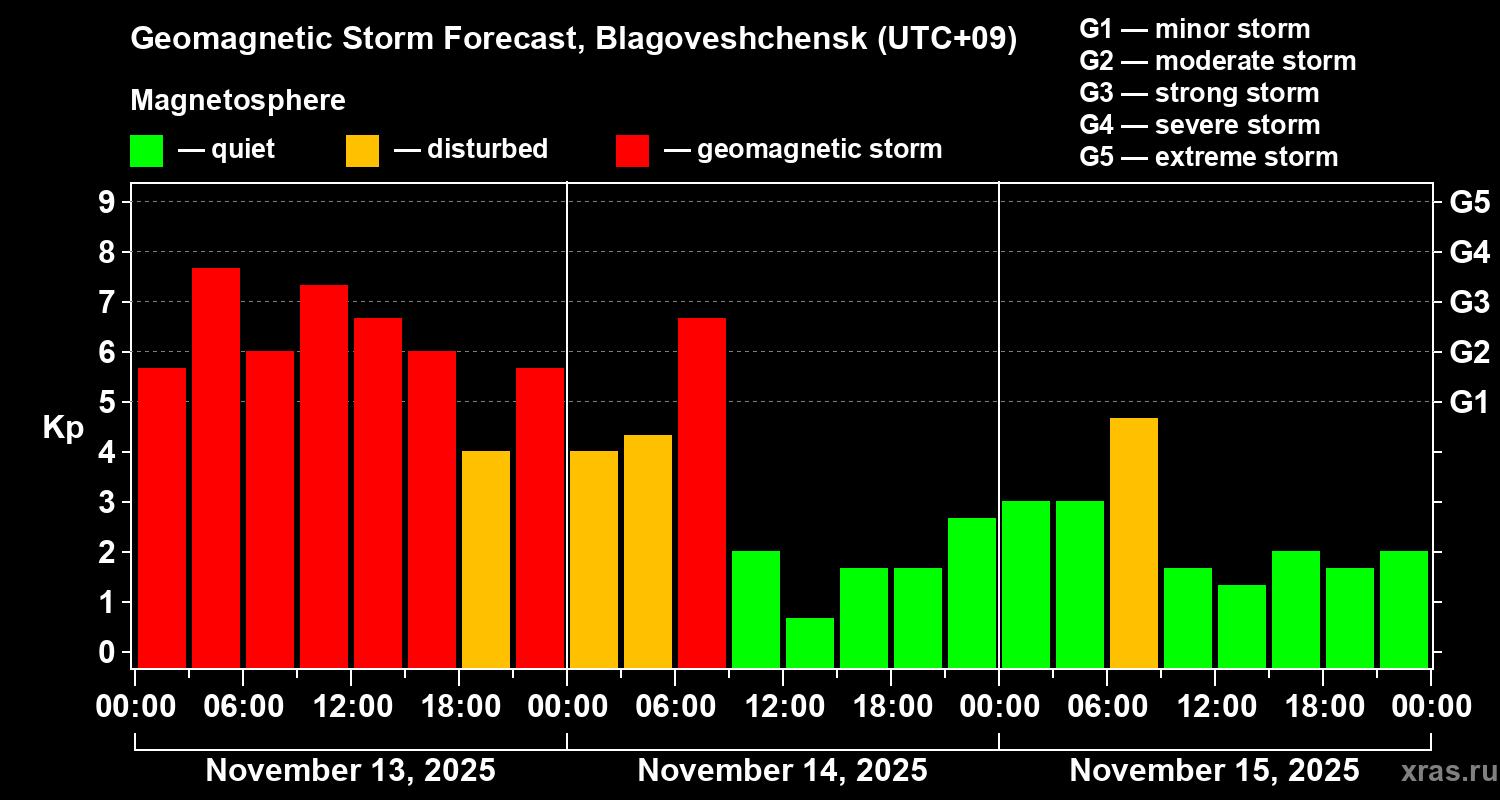 Geomagnetic storm forecast in Blagoveshchensk for Nov 13, 2025