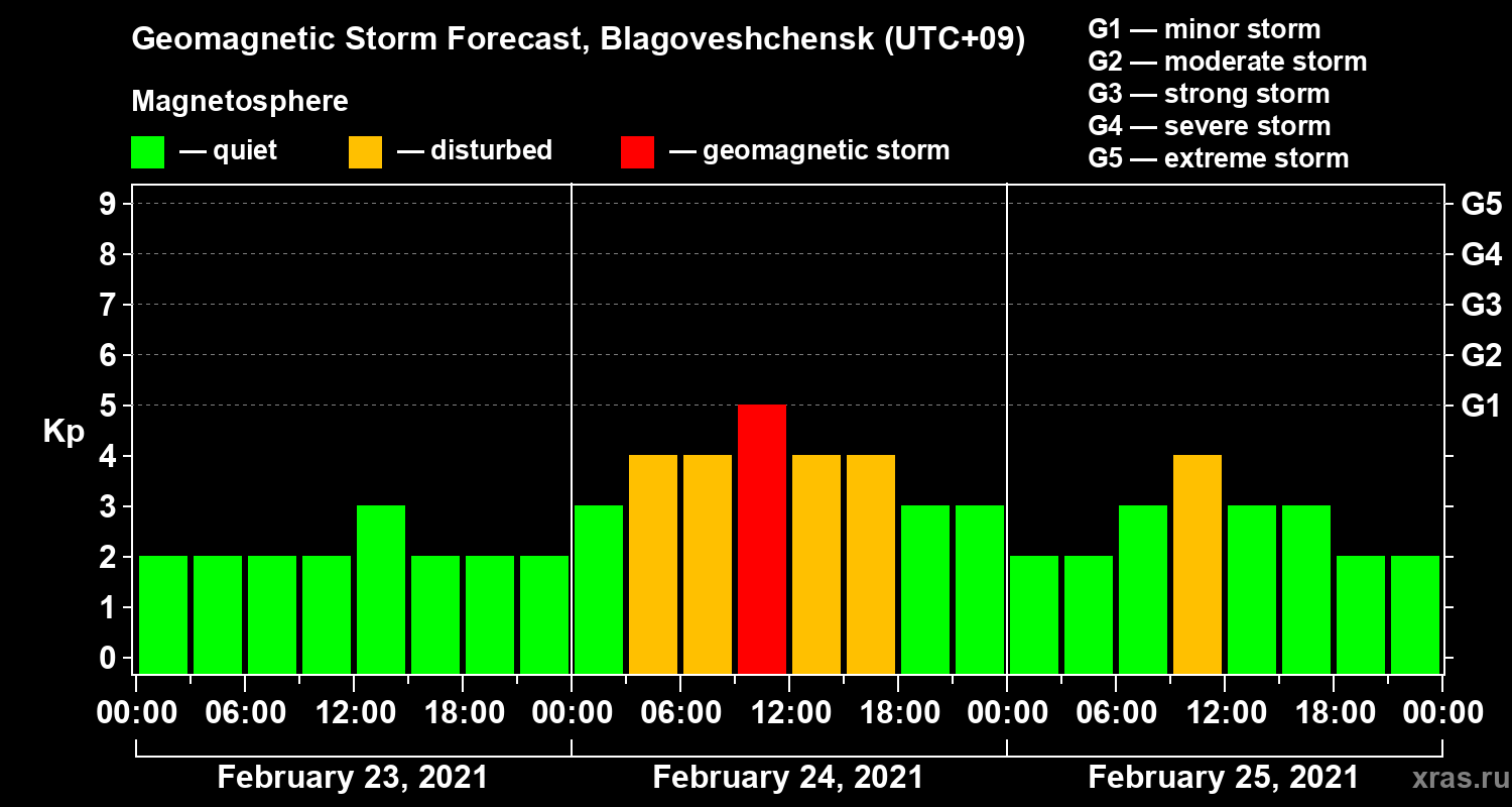 Geomagnetic storm forecast in Blagoveshchensk for Feb 23, 2021