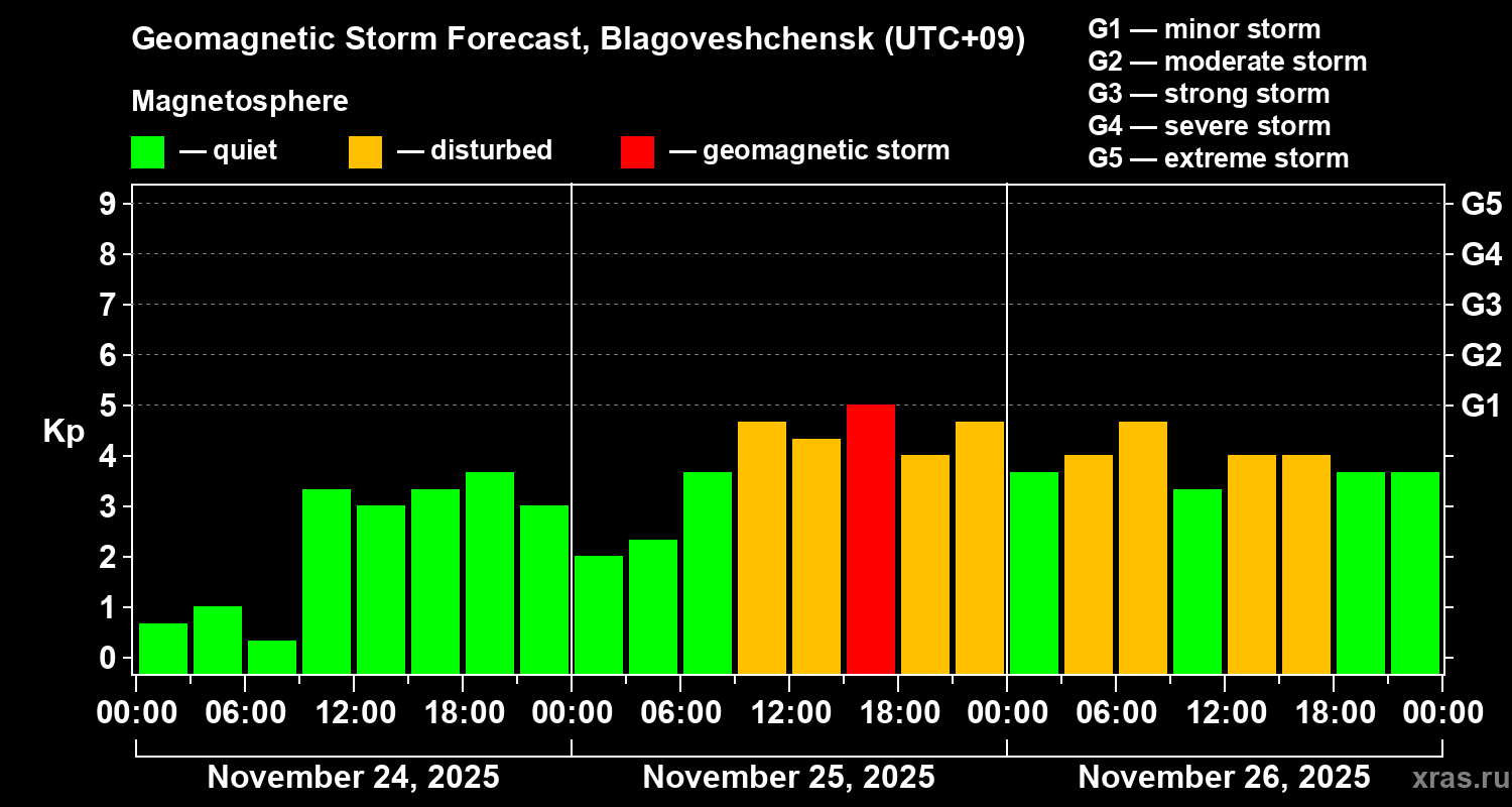 Geomagnetic storm forecast in Blagoveshchensk for Nov 24, 2025