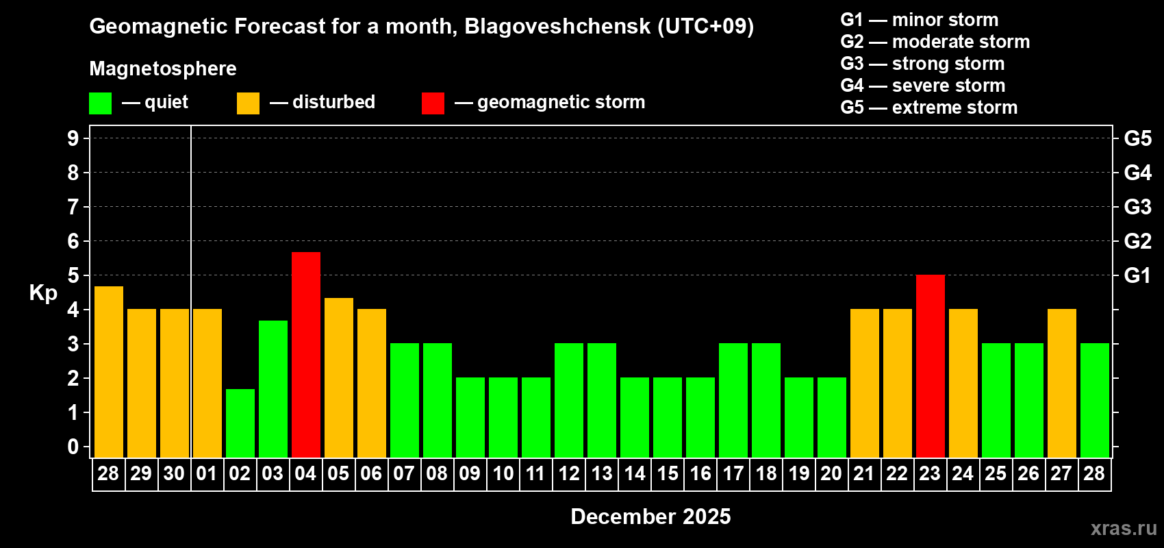 Geomagnetic storm forecast in Blagoveshchensk for Nov 28, 2025