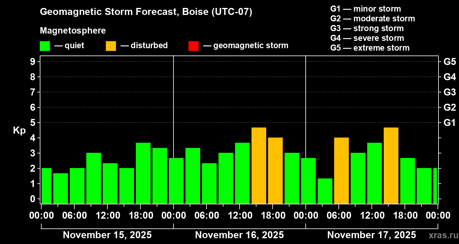 Geomagnetic storm forecast in Boise for Nov 15, 2025