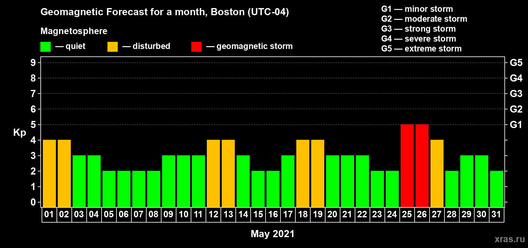 Geomagnetic storm forecast in Boston for May 01, 2021