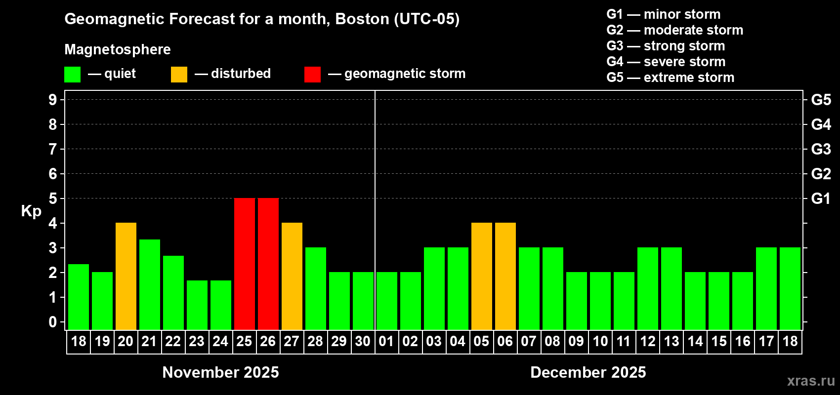 Geomagnetic storm forecast in Boston for Nov 18, 2025