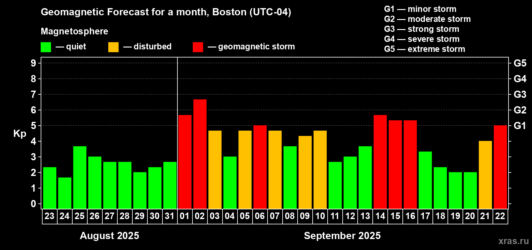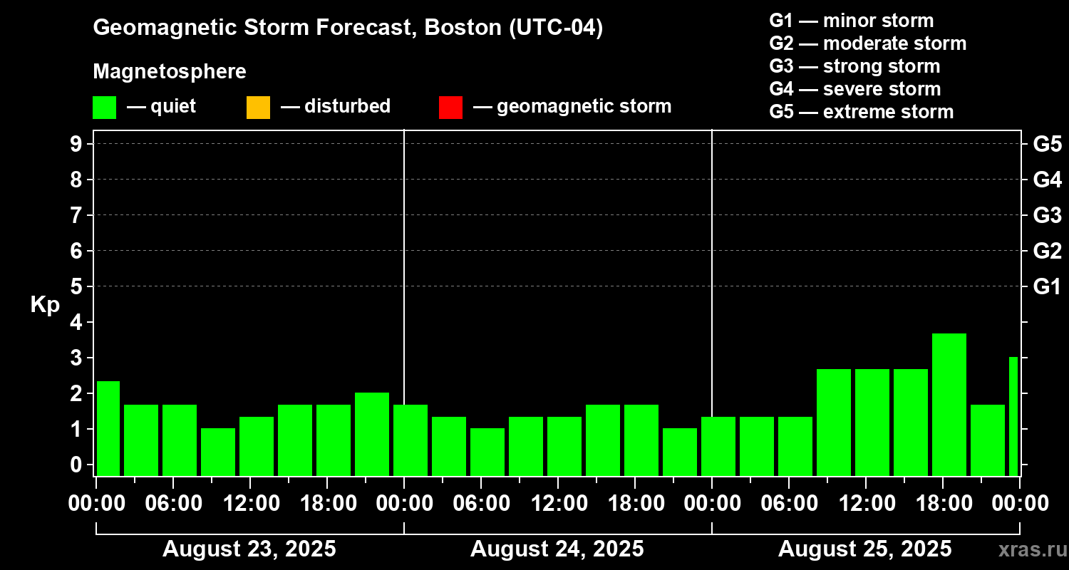 Geomagnetic storm forecast in Boston for Aug 23, 2025