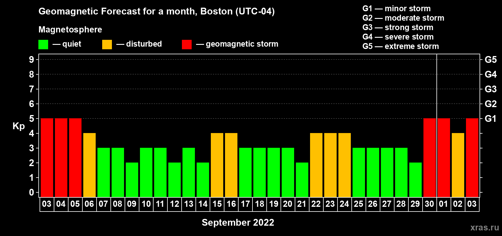 Geomagnetic storm forecast in Boston for Sep 03, 2022