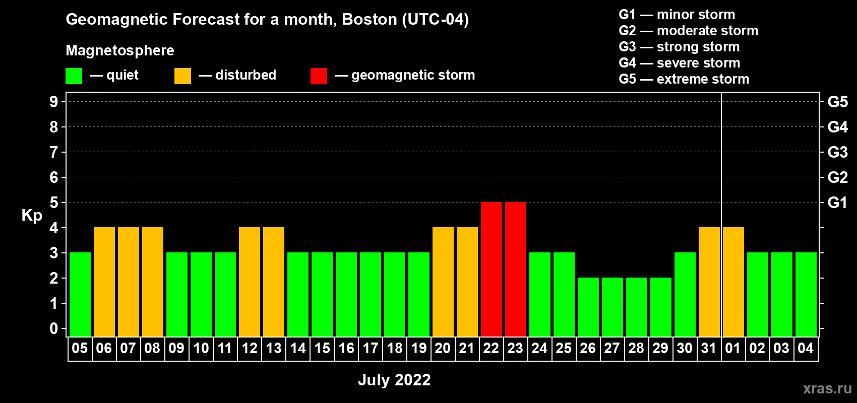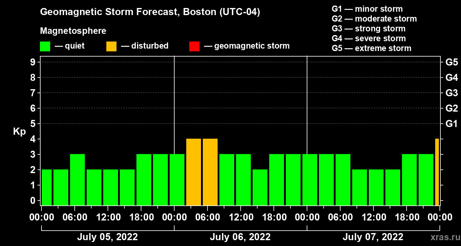 Geomagnetic storm forecast in Boston for Jul 05, 2022