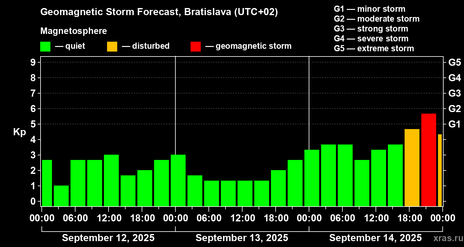 Geomagnetic storm forecast in Bratislava for Sep 12, 2025