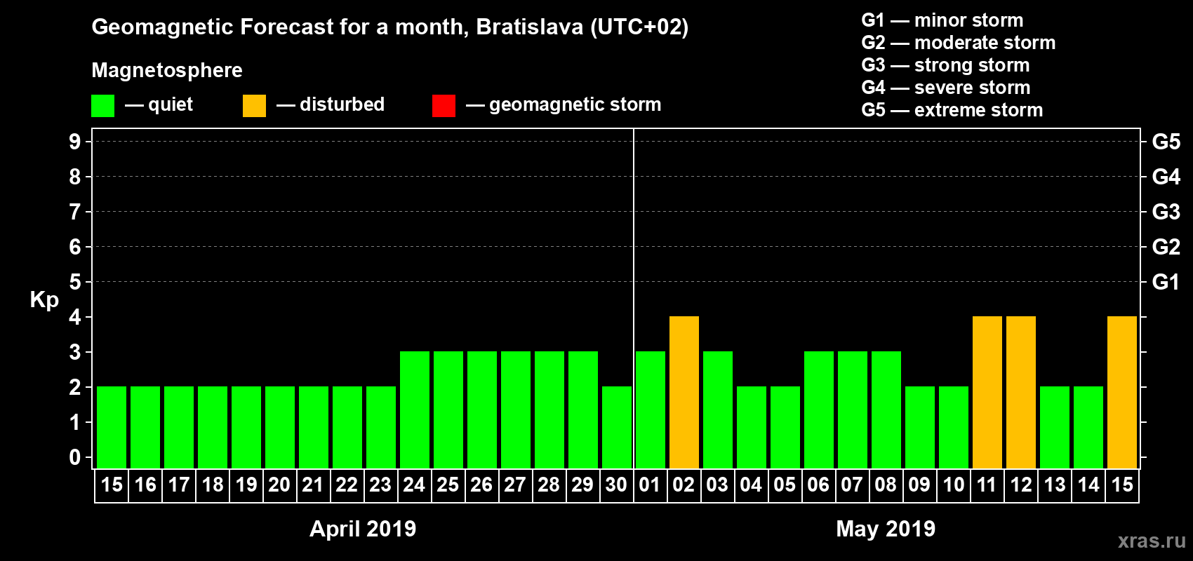 Geomagnetic storm forecast in Bratislava for Apr 15, 2019