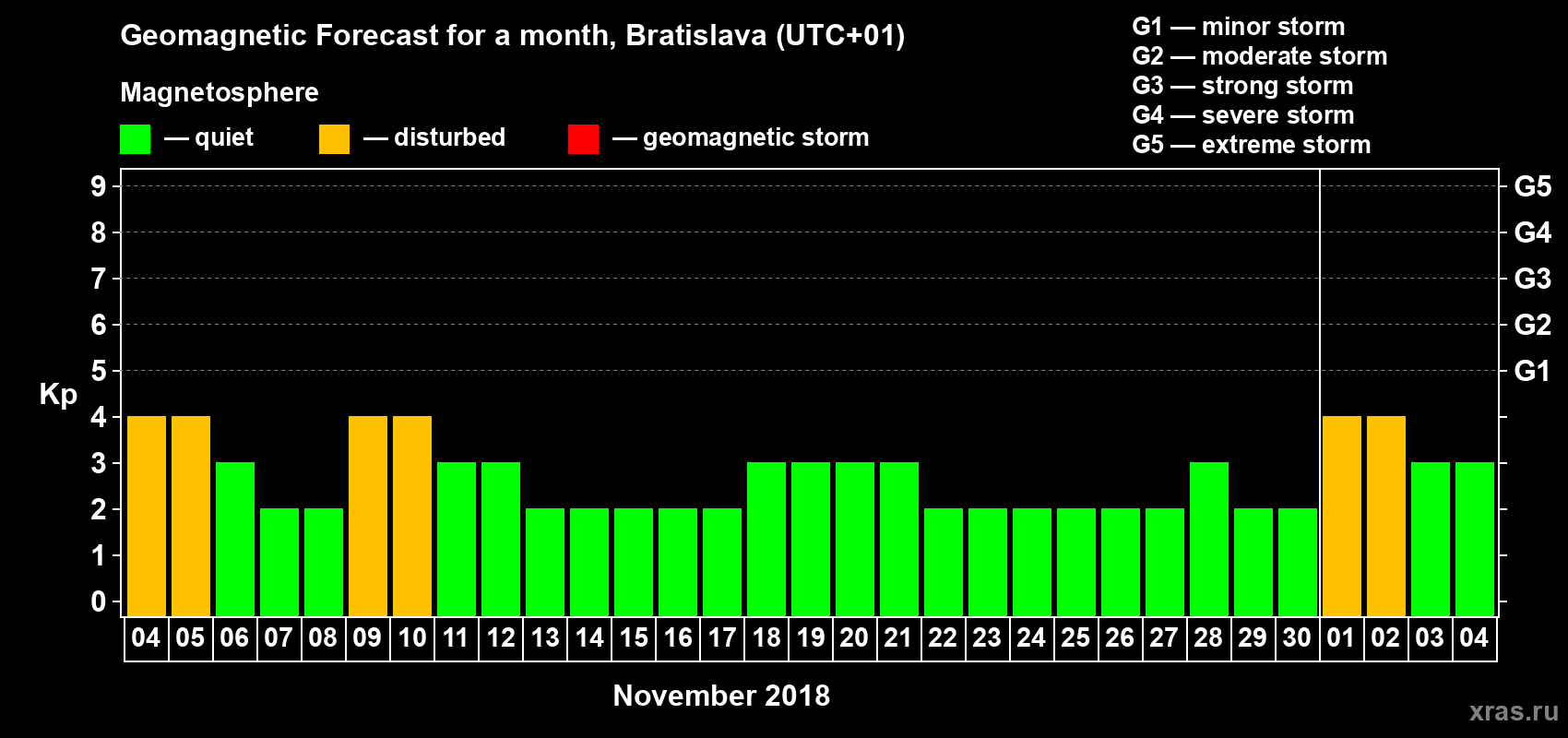 Geomagnetic storm forecast in Bratislava for Nov 04, 2018