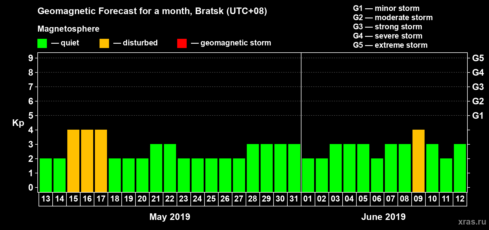 Geomagnetic storm forecast in Bratsk for May 13, 2019