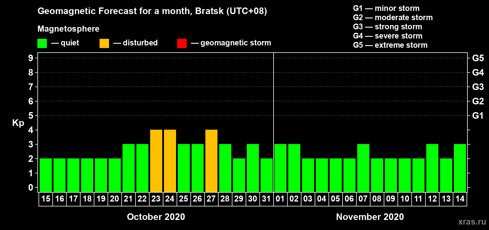 Geomagnetic storm forecast in Bratsk for Oct 15, 2020