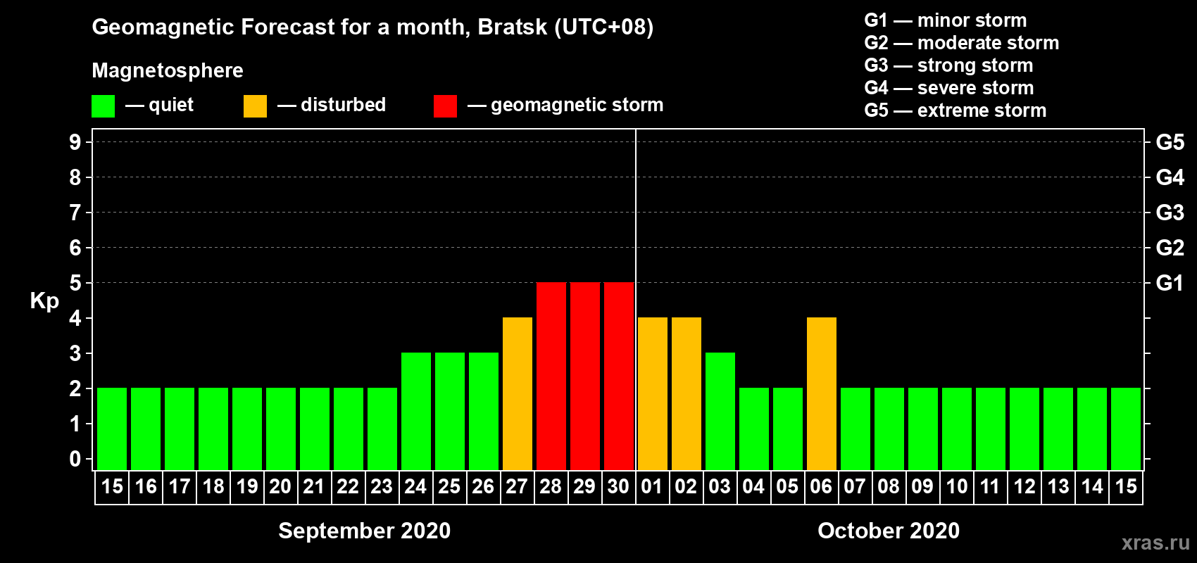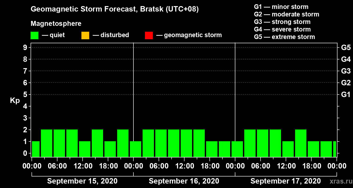 Geomagnetic storm forecast in Bratsk for Sep 15, 2020