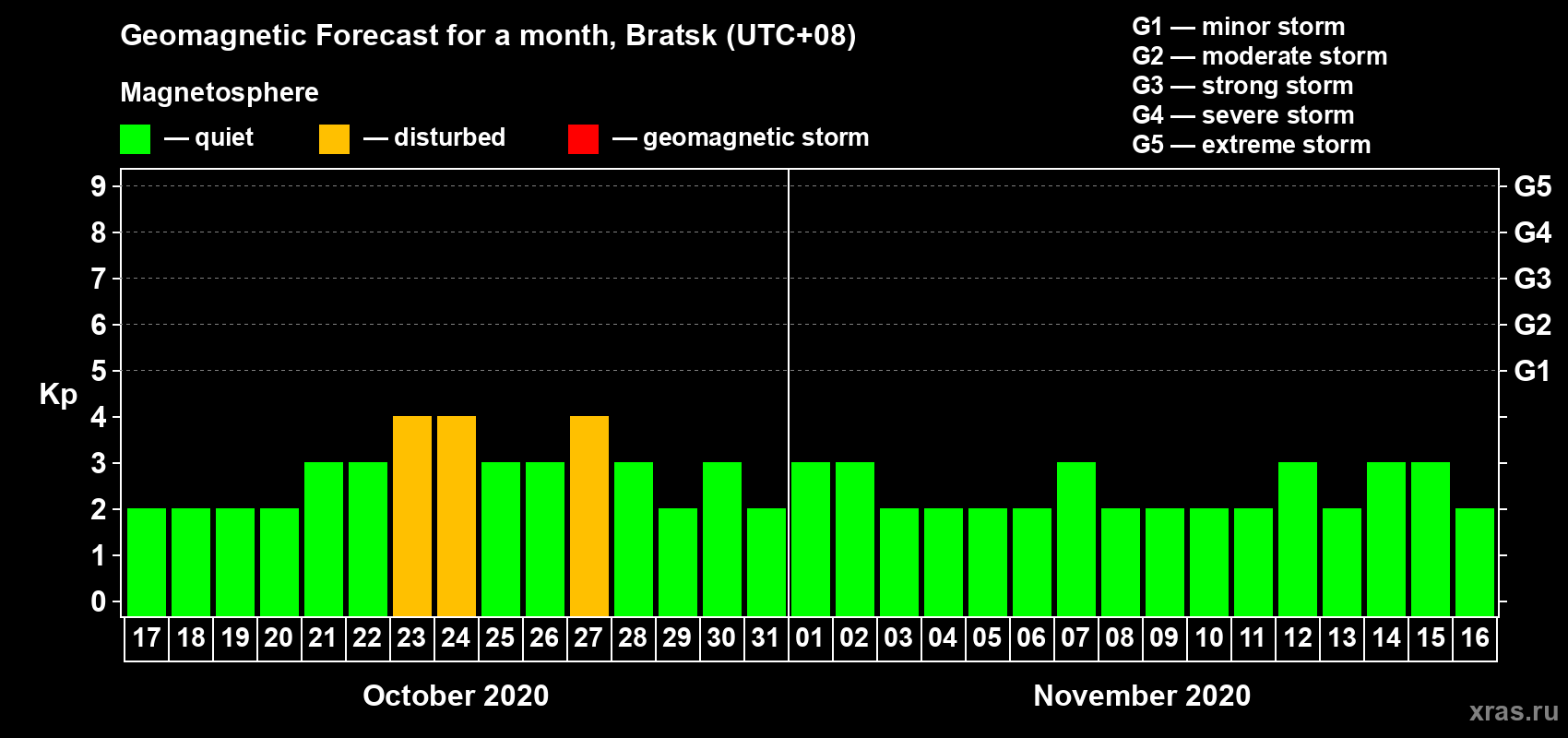 Geomagnetic storm forecast in Bratsk for Oct 17, 2020