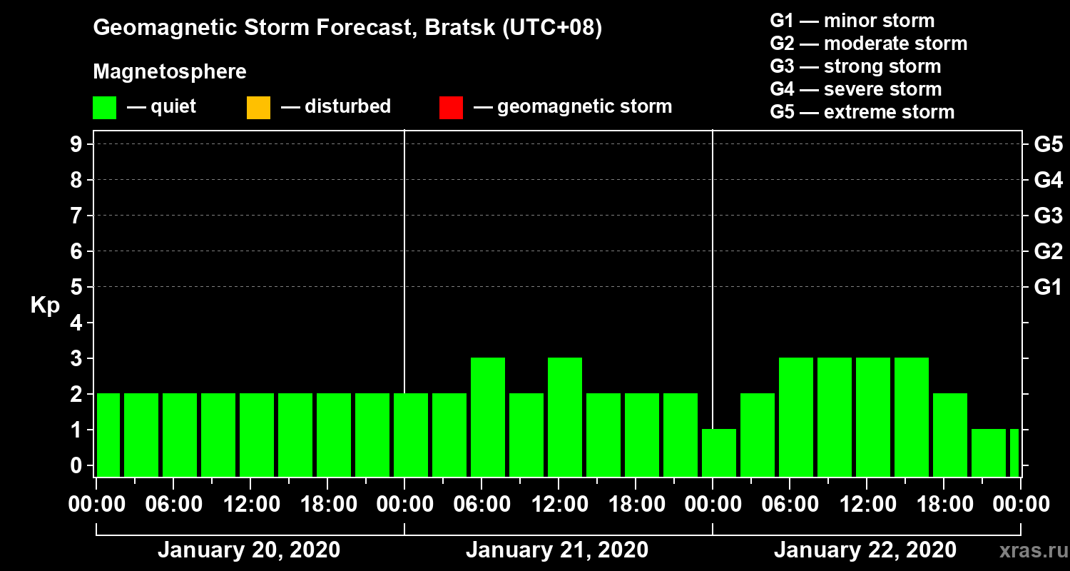 Geomagnetic storm forecast in Bratsk for Jan 20, 2020