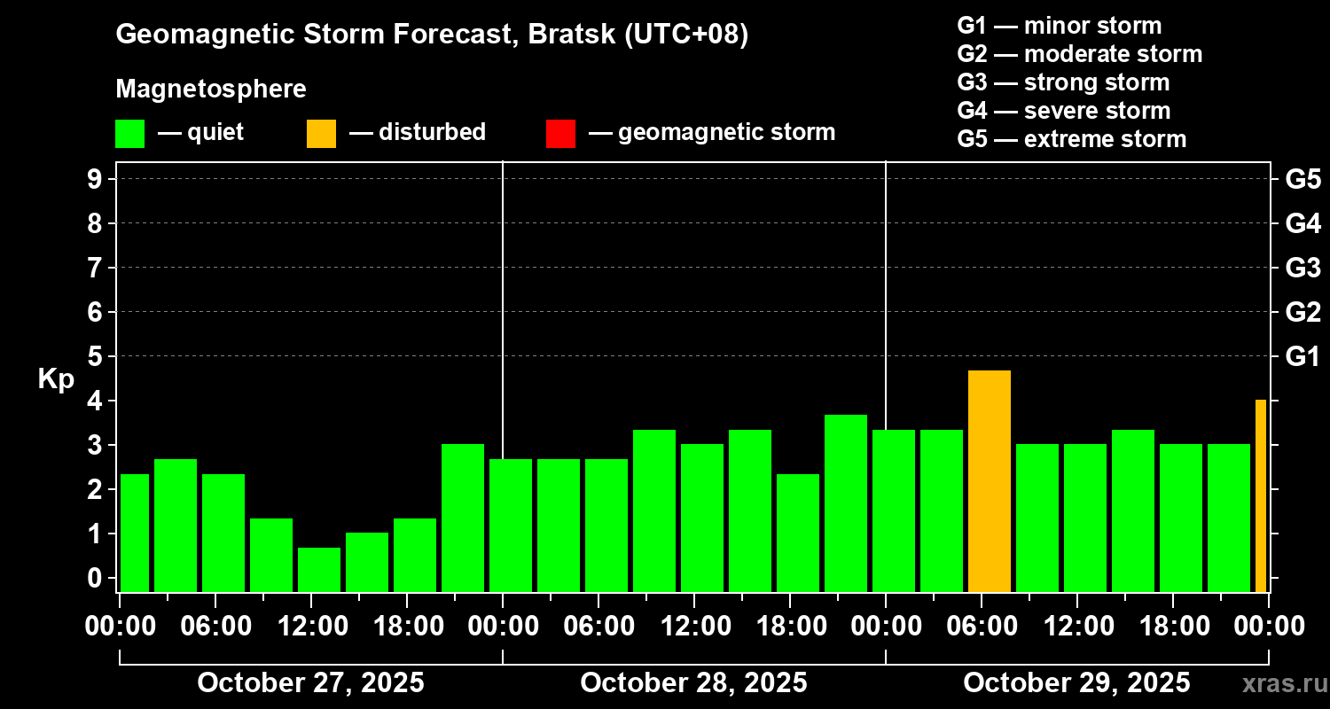 Geomagnetic storm forecast in Bratsk for Oct 27, 2025