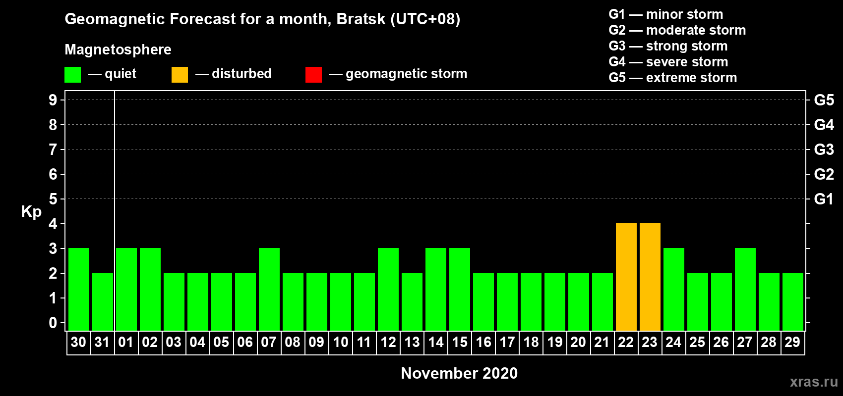 Geomagnetic storm forecast in Bratsk for Oct 30, 2020
