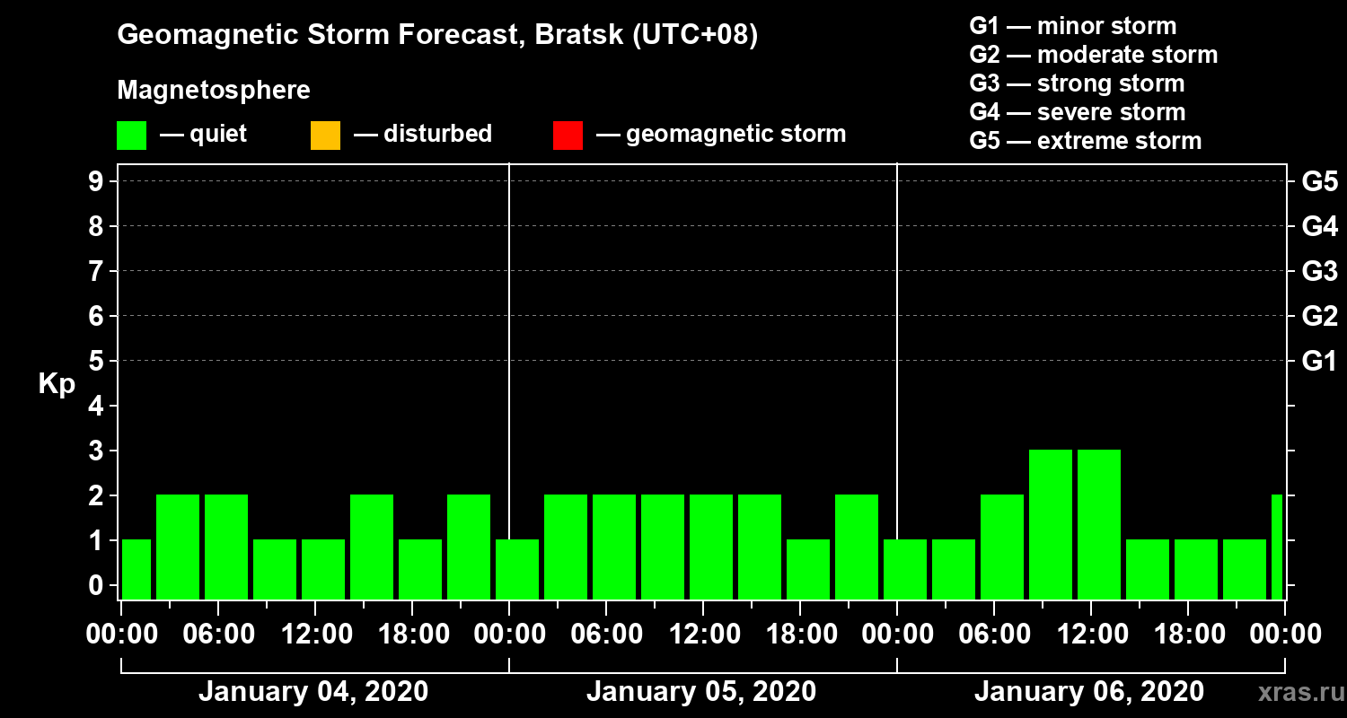 Geomagnetic storm forecast in Bratsk for Jan 04, 2020
