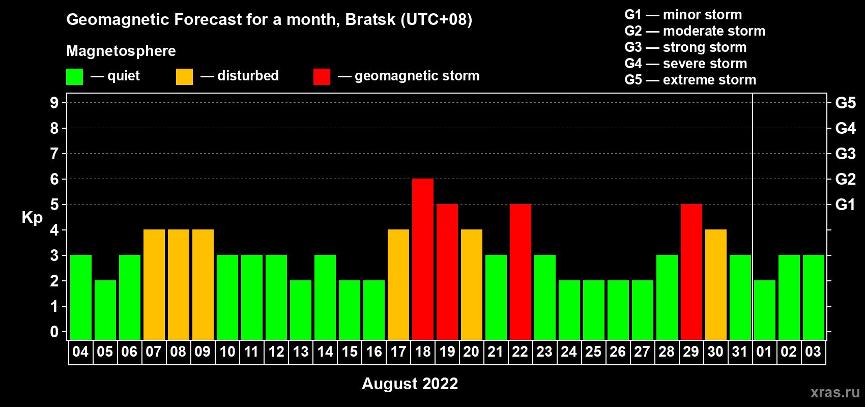 Geomagnetic storm forecast in Bratsk for Aug 04, 2022