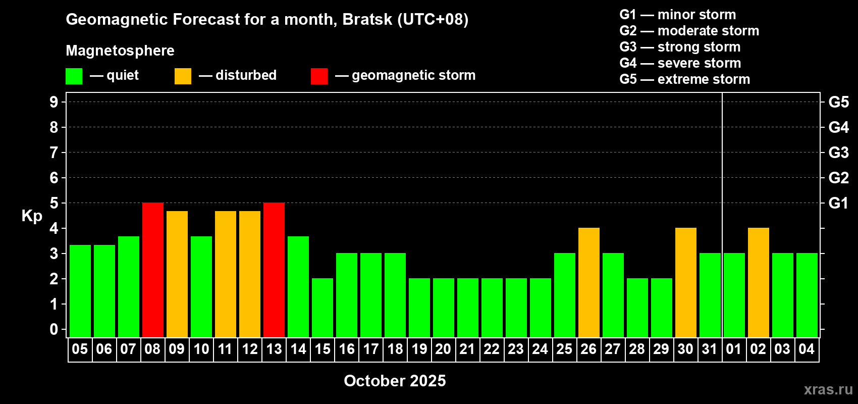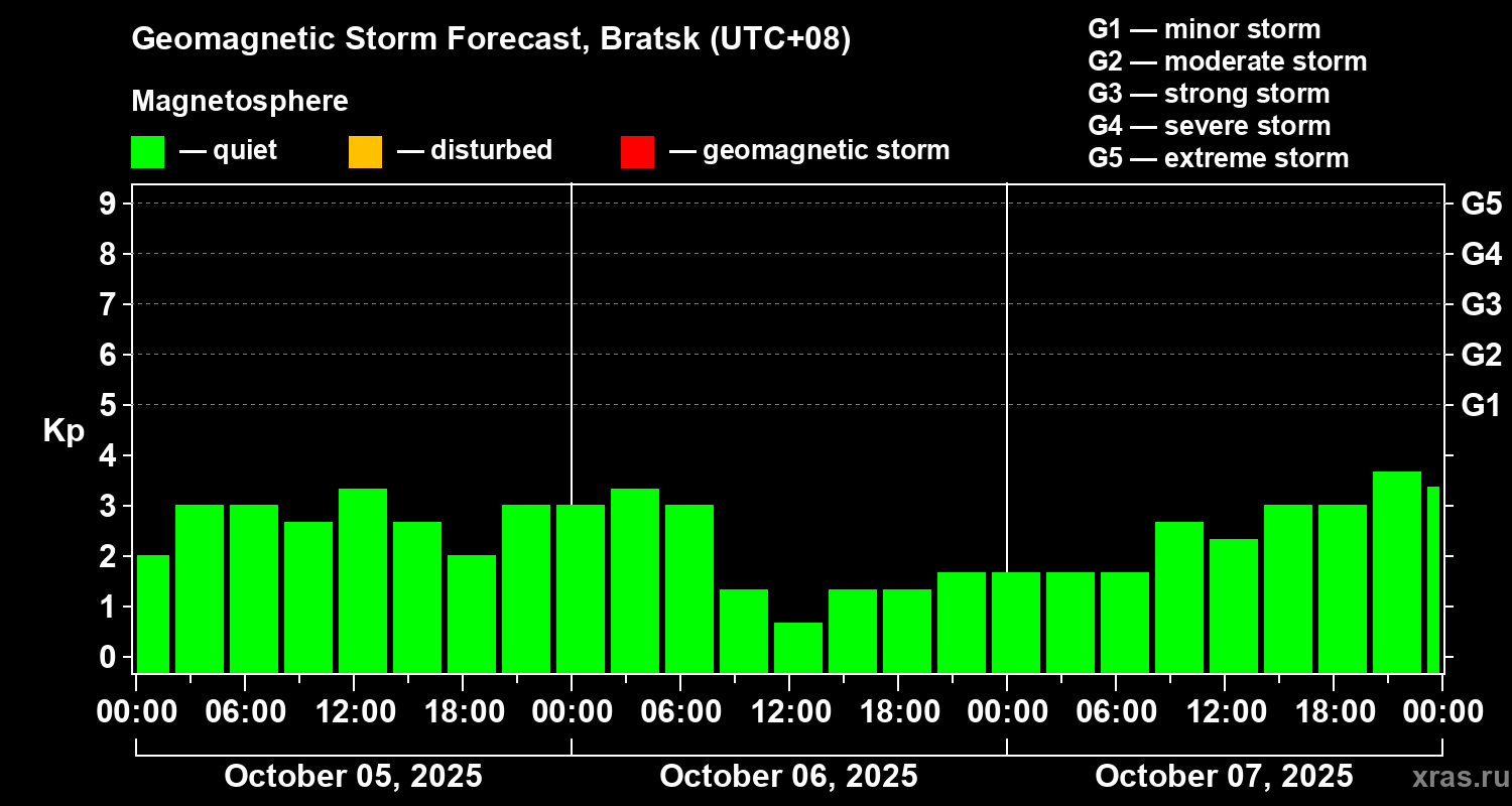 Geomagnetic storm forecast in Bratsk for Oct 05, 2025