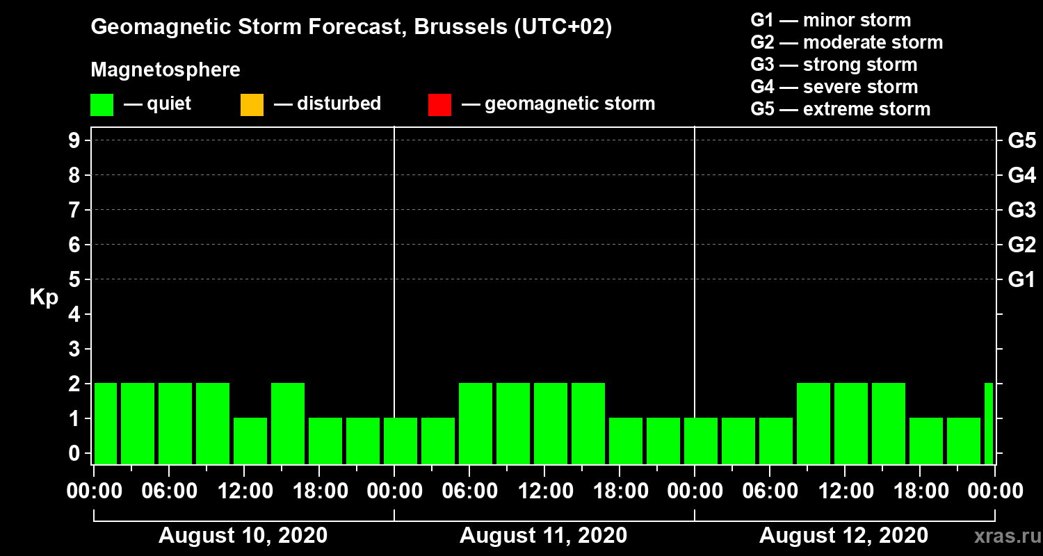 Geomagnetic storm forecast in Brussels for Aug 10, 2020