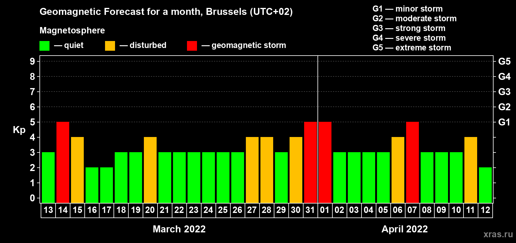 Geomagnetic activity forecast in Brussels — Mar 13, 2022