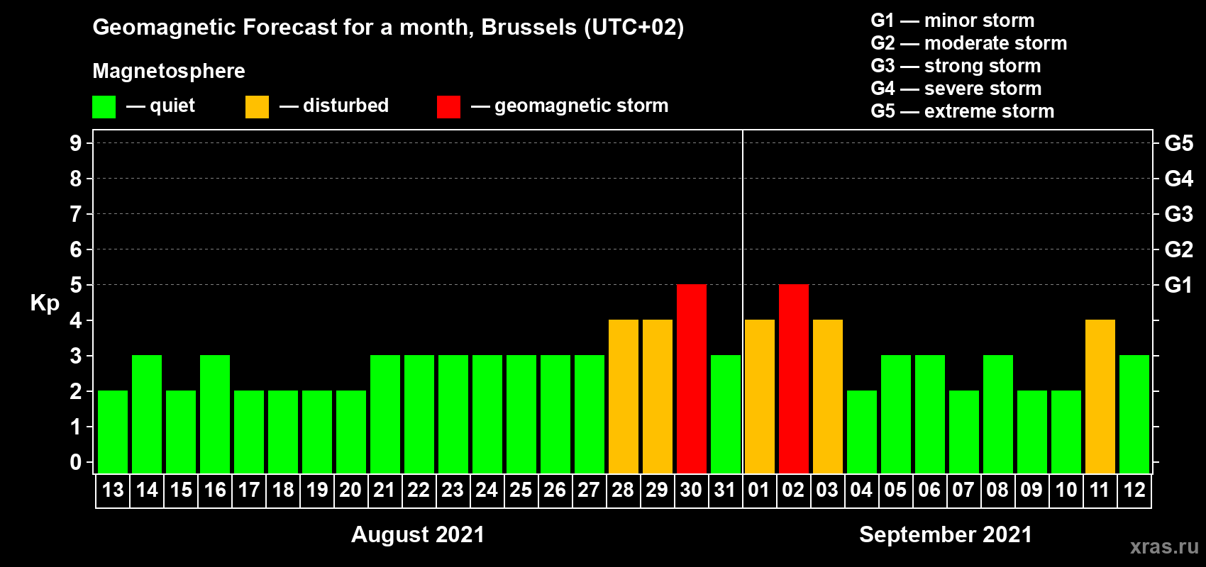 Geomagnetic storm forecast in Brussels for Aug 13, 2021