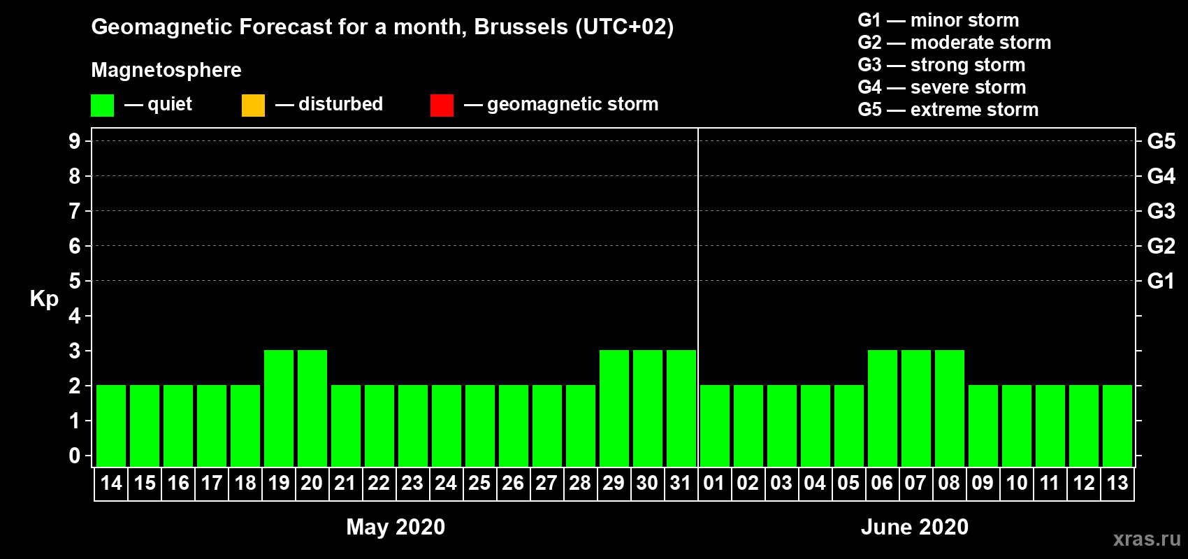 Geomagnetic activity forecast in Brussels — May 14, 2020