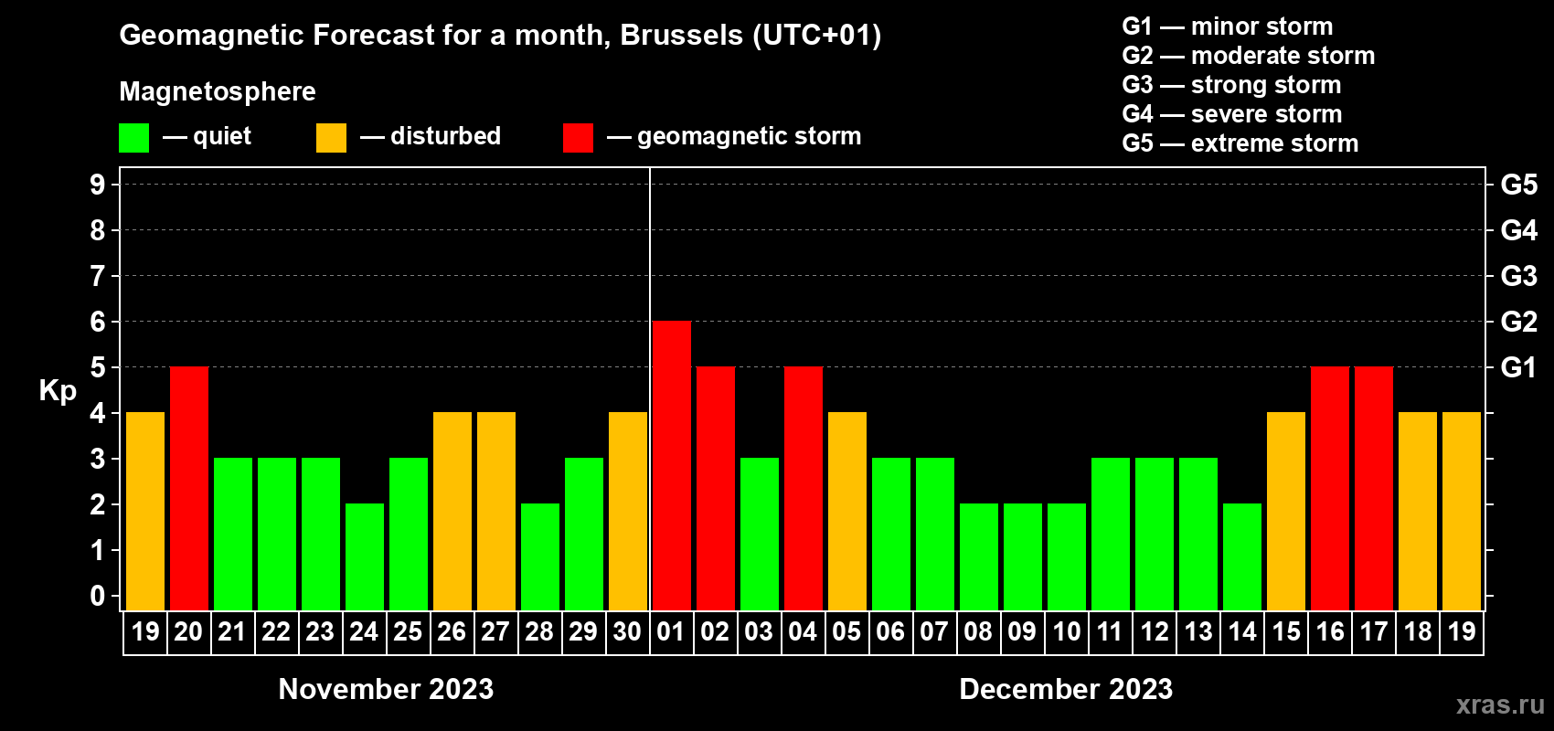 Geomagnetic storm forecast in Brussels for Nov 19, 2023