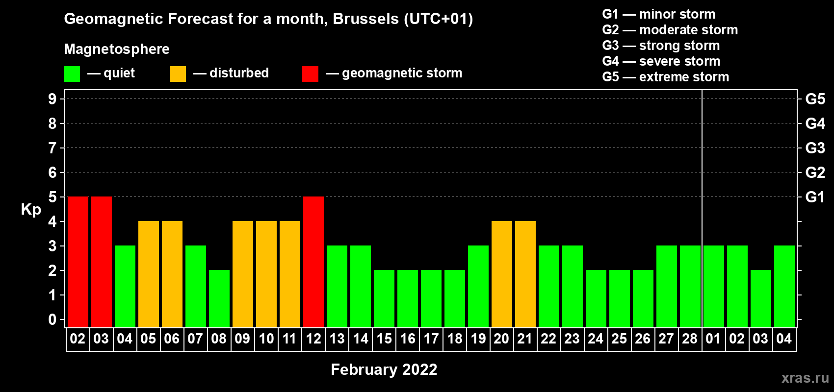 Geomagnetic storm forecast in Brussels for Feb 02, 2022