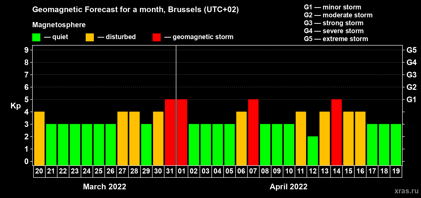 Geomagnetic storm forecast in Brussels for Mar 20, 2022