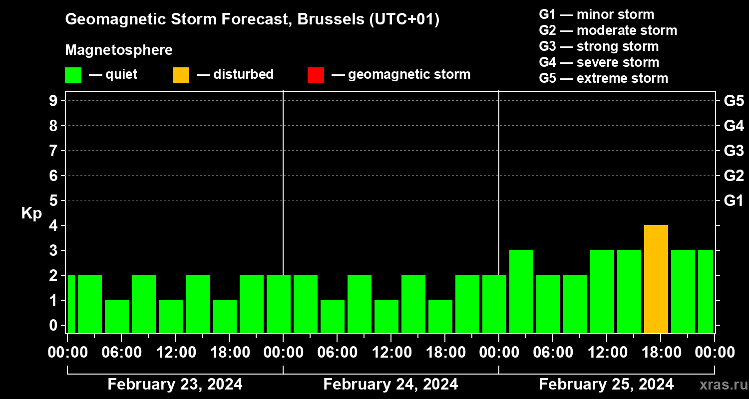 Geomagnetic activity forecast in Brussels — Feb 23, 2024