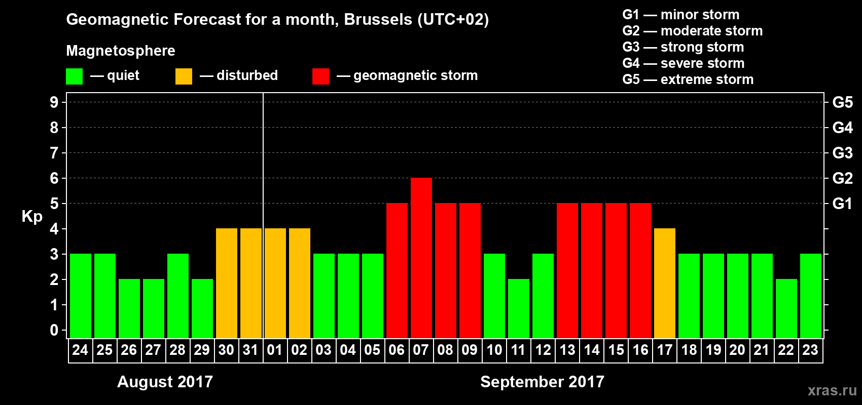 Geomagnetic storm forecast in Brussels for Aug 24, 2017