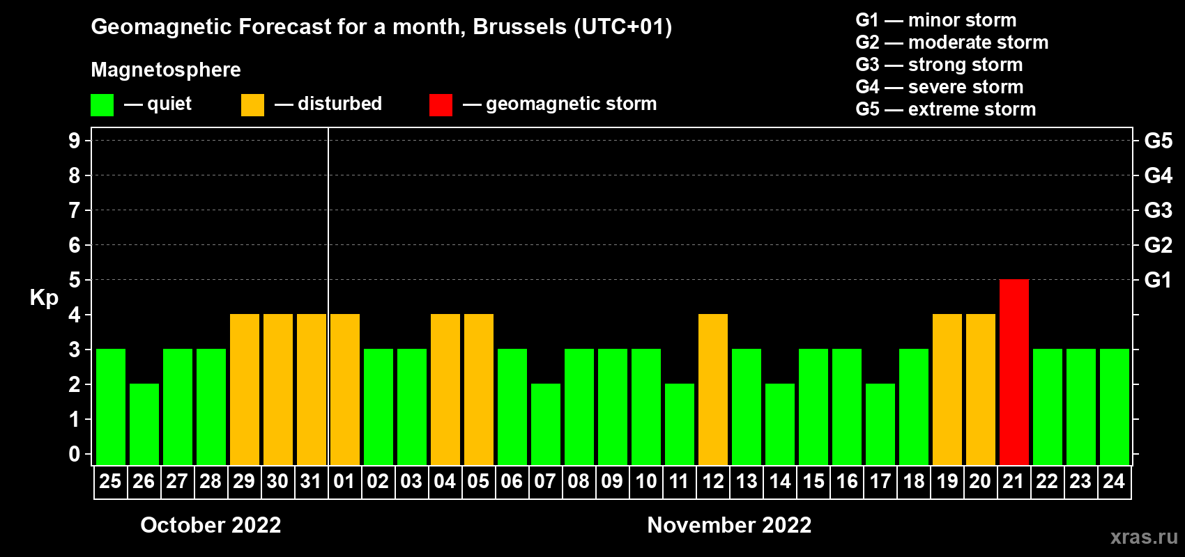 Geomagnetic storm forecast in Brussels for Oct 25, 2022