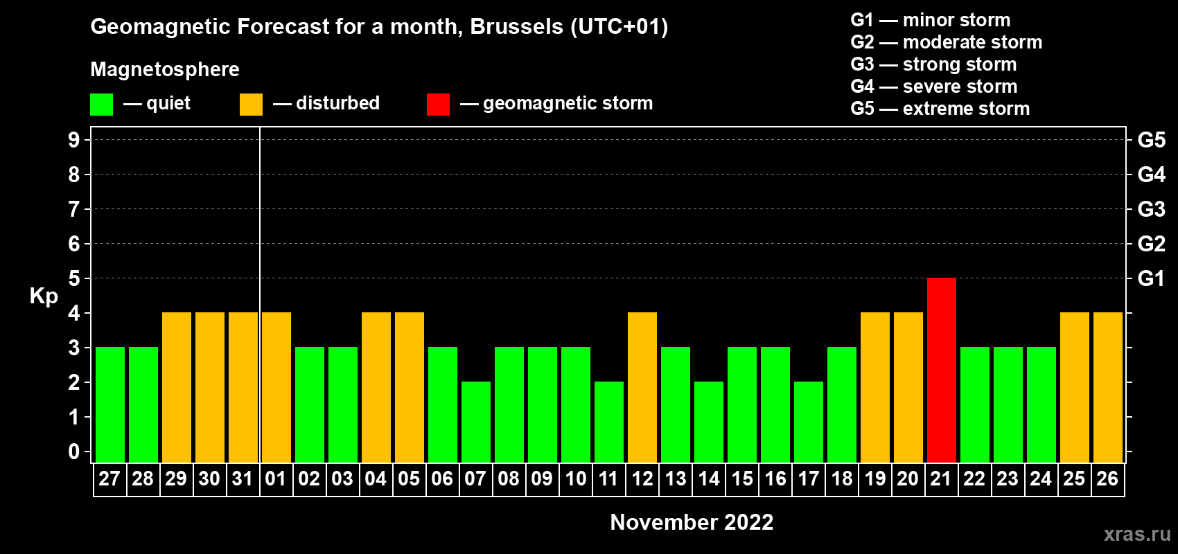 Geomagnetic storm forecast in Brussels for Oct 27, 2022