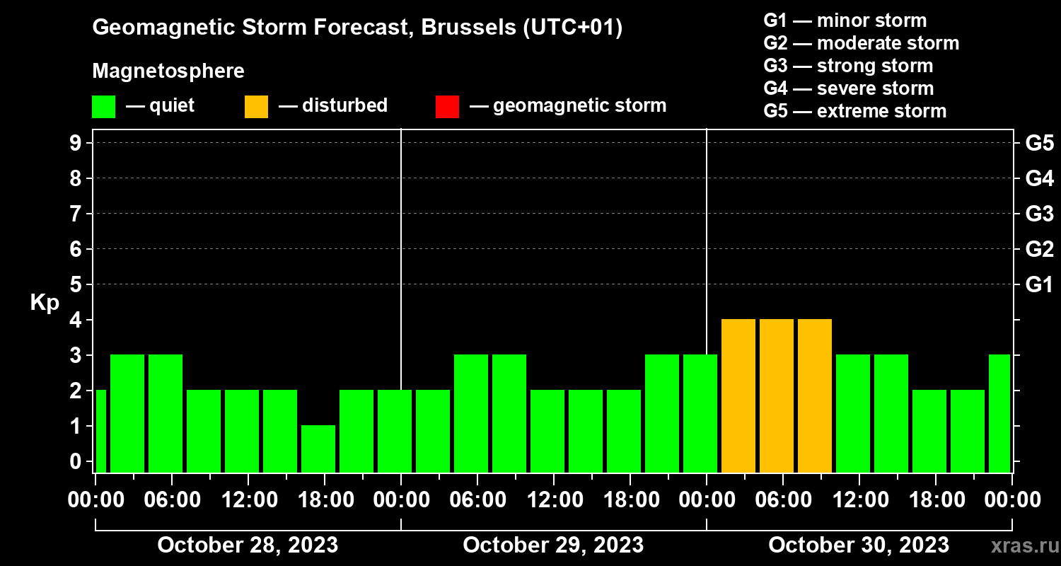 Geomagnetic activity forecast in Brussels — Oct 28, 2023