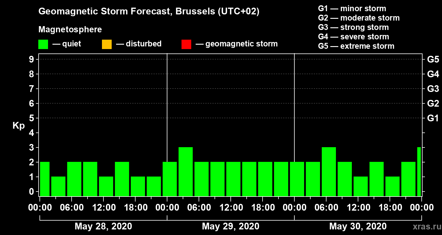 Geomagnetic storm forecast in Brussels for May 28, 2020
