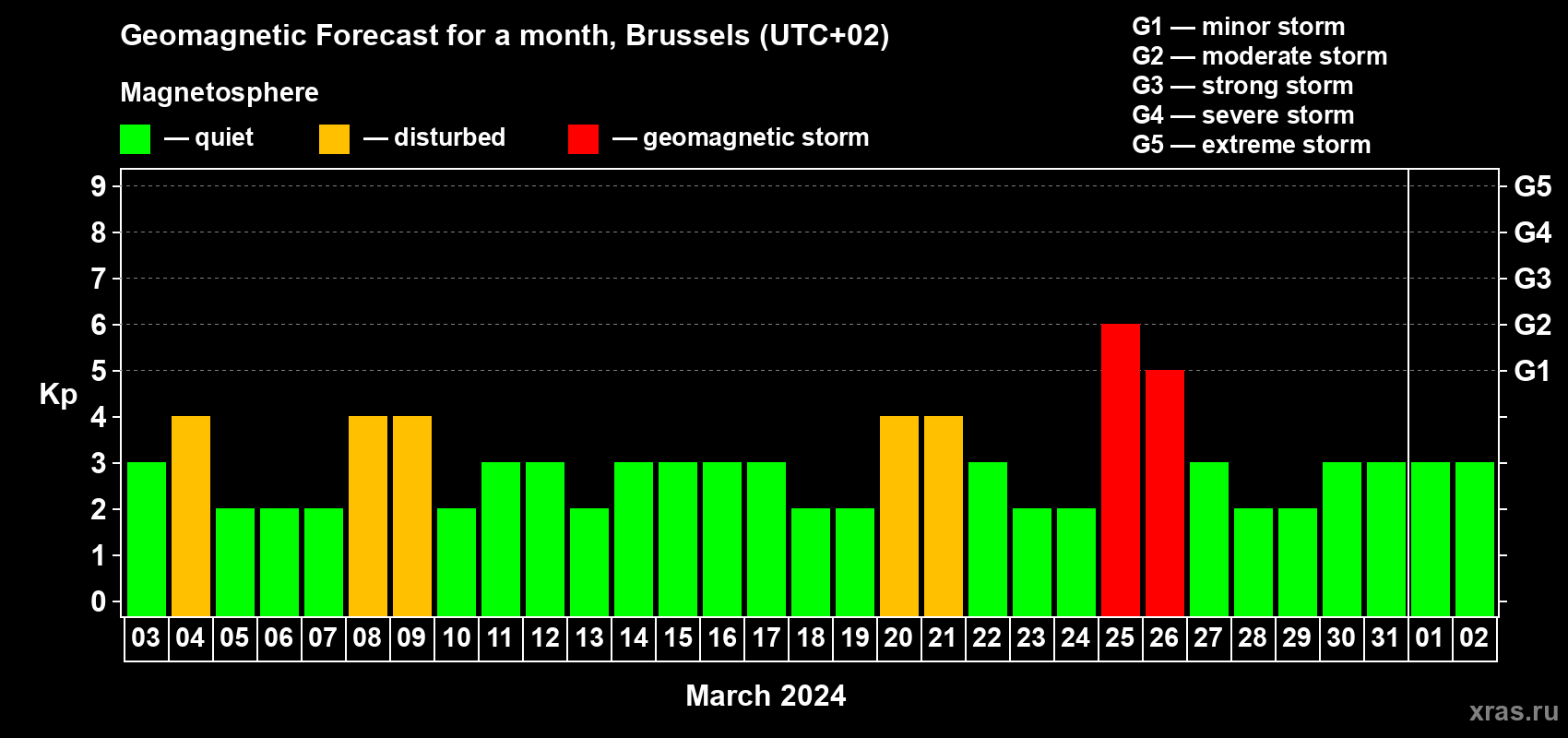 Geomagnetic activity forecast in Brussels — Mar 03, 2024