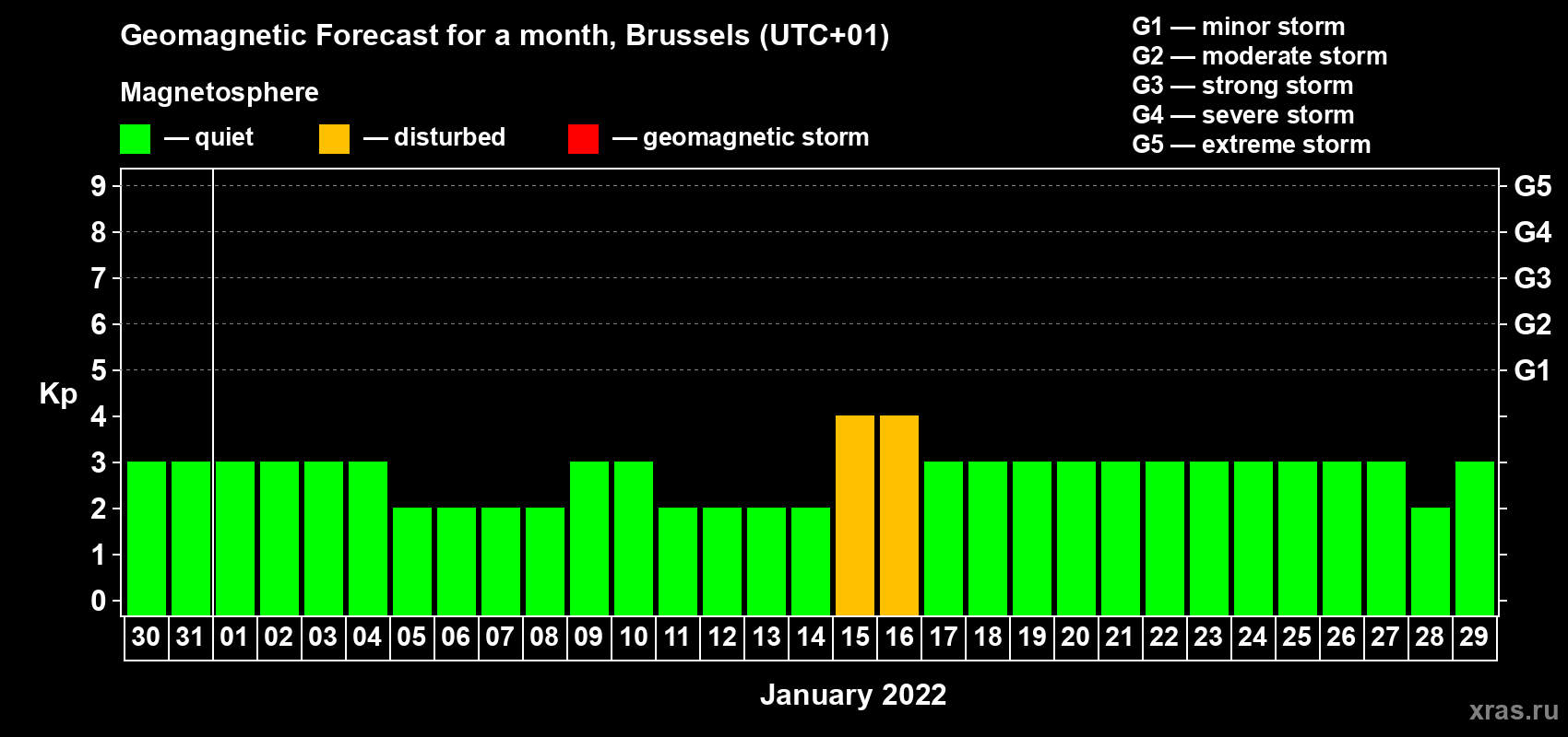 Geomagnetic storm forecast in Brussels for Dec 30, 2021
