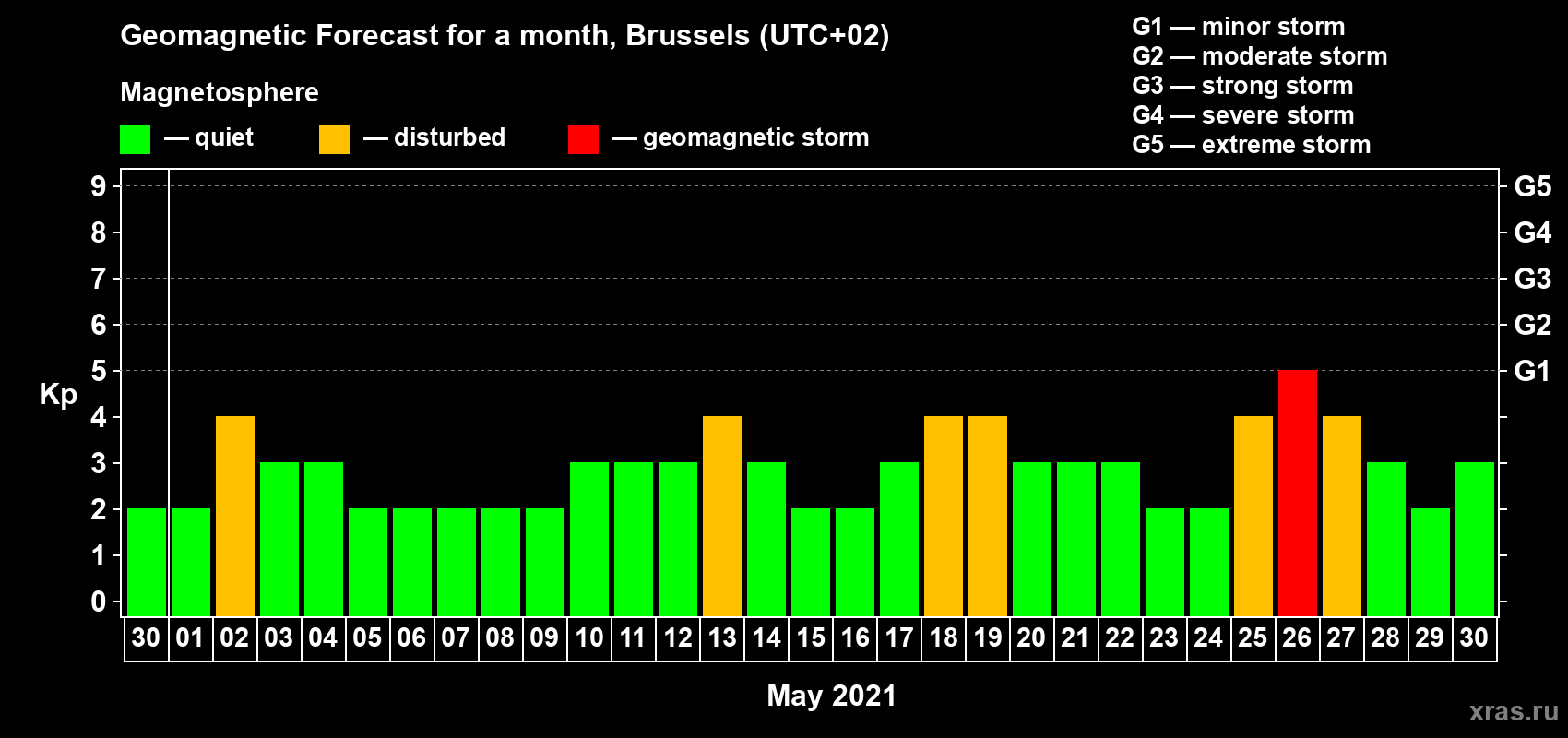 Geomagnetic storm forecast in Brussels for Apr 30, 2021