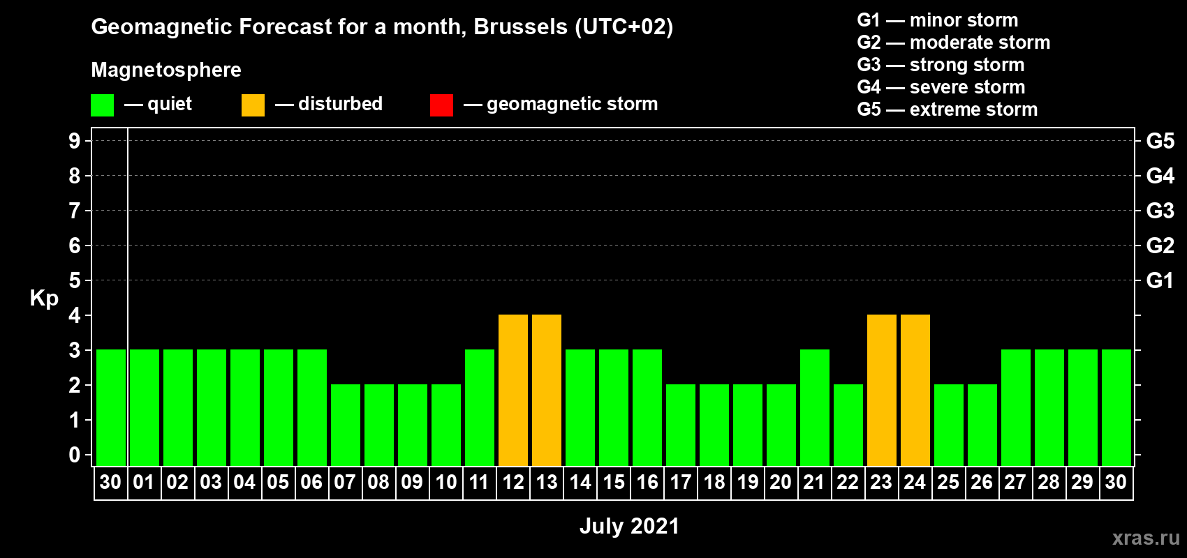 Geomagnetic storm forecast in Brussels for Jun 30, 2021
