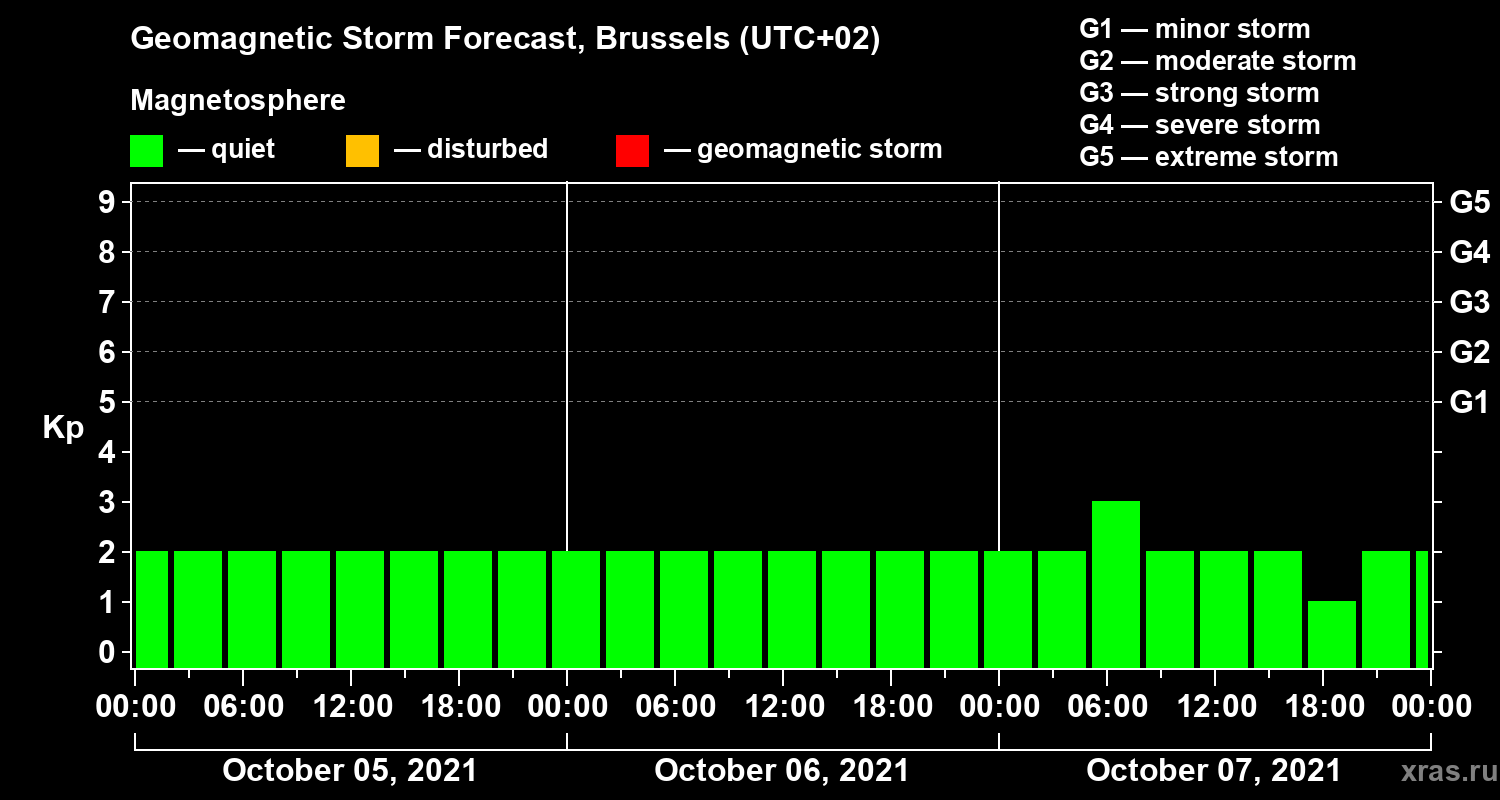 Geomagnetic storm forecast in Brussels for Oct 05, 2021