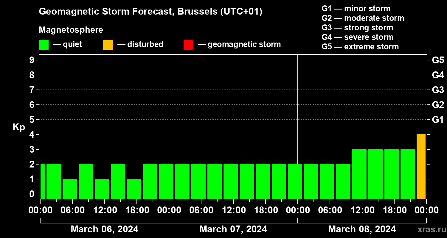 Geomagnetic storm forecast in Brussels for Mar 06, 2024