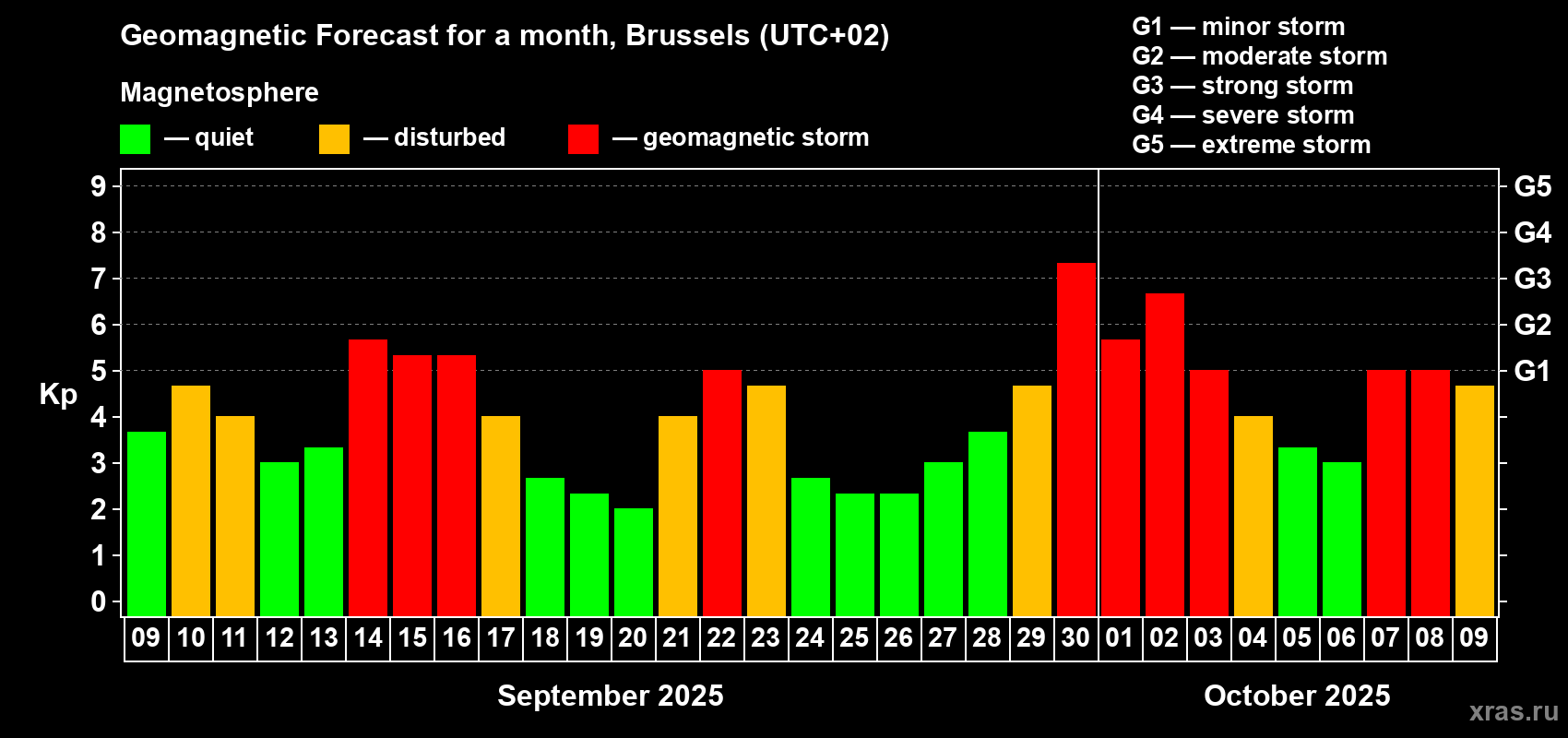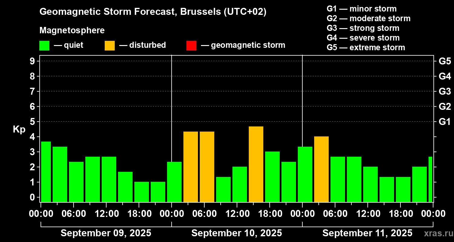 Geomagnetic storm forecast in Brussels for Sep 09, 2025