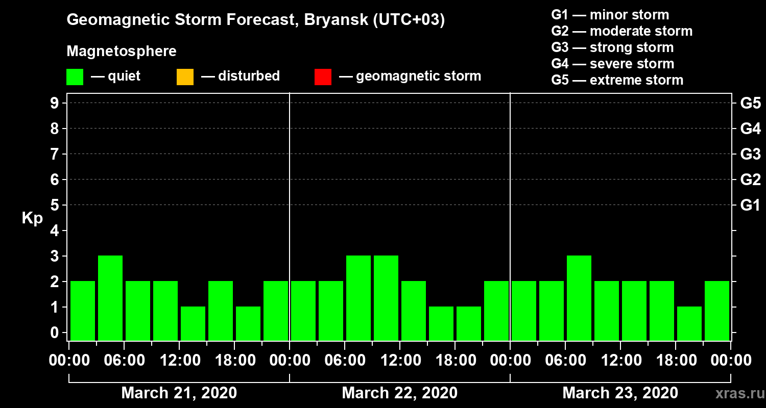 Geomagnetic storm forecast in Bryansk for Mar 21, 2020