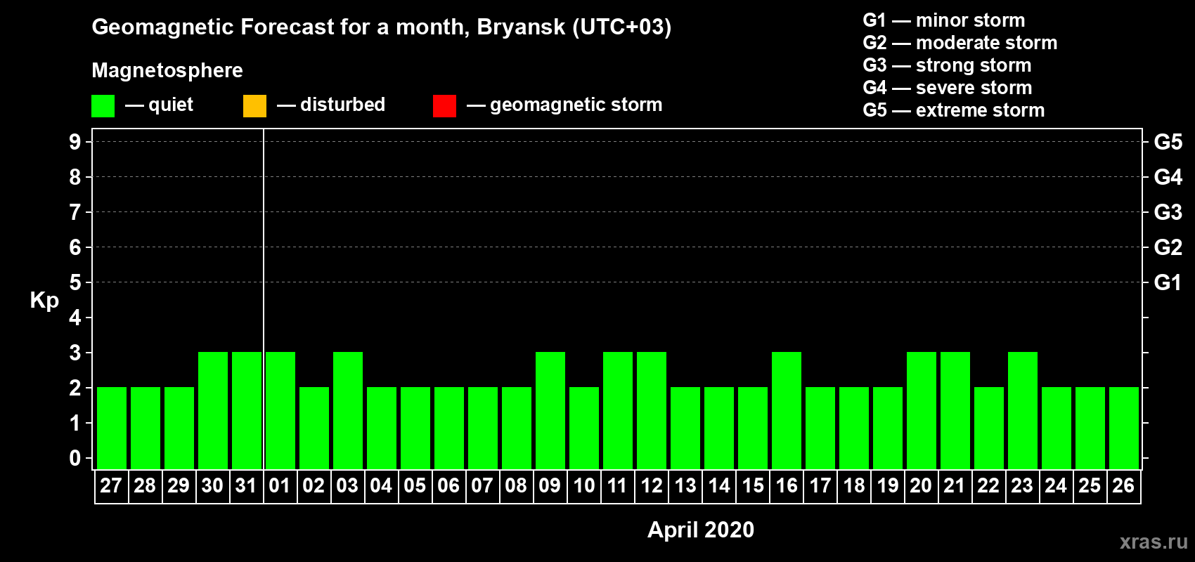 Geomagnetic activity forecast in Bryansk — Mar 27, 2020