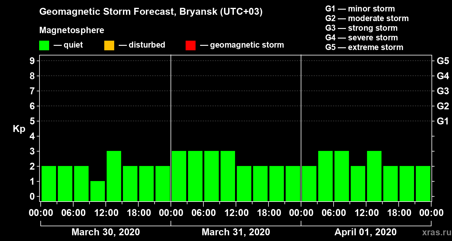 Geomagnetic storm forecast in Bryansk for Mar 30, 2020