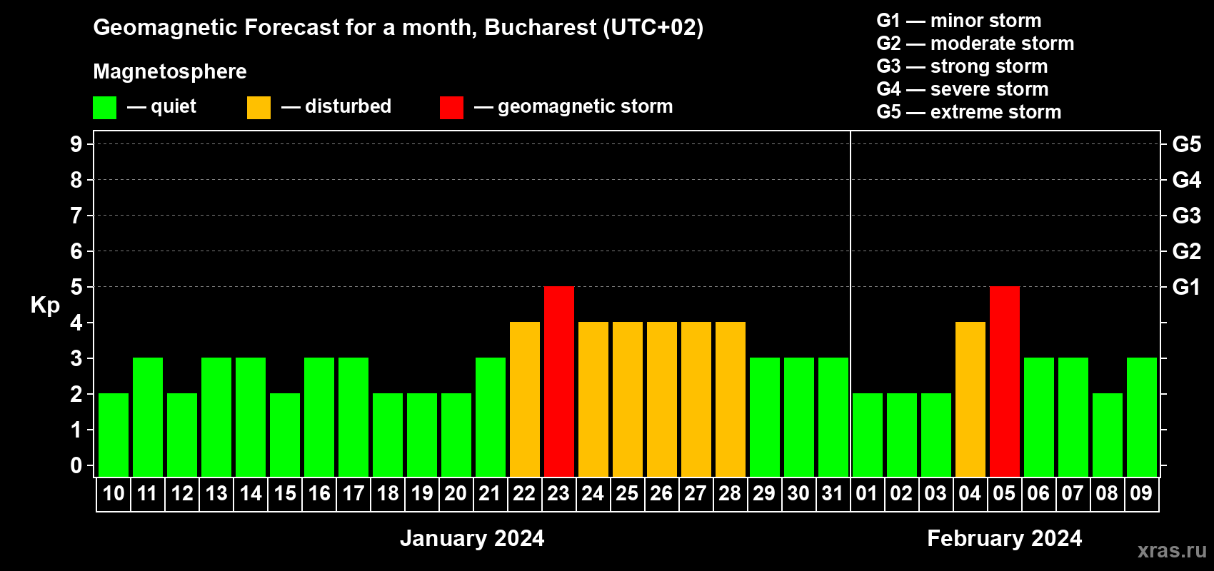 Geomagnetic storm forecast in Bucharest for Jan 10, 2024