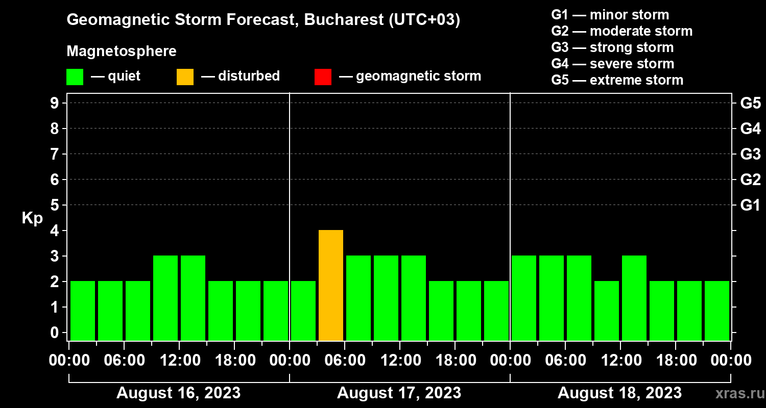 Geomagnetic storm forecast in Bucharest for Aug 16, 2023
